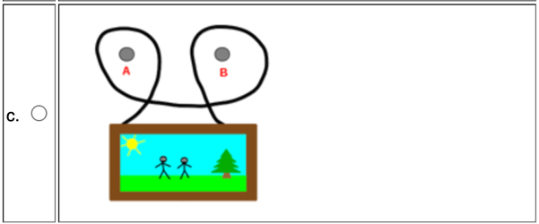 Sneaky Sarah is hanging a picture on her brother's wall using two nails, A and B and a piece of string. She hangs the picture in such a way that if her brother accidentally knocks out either nail A or nail B, the picture will fall down. Which image below illustrates the way Sarah wrapped the string around the nails?
